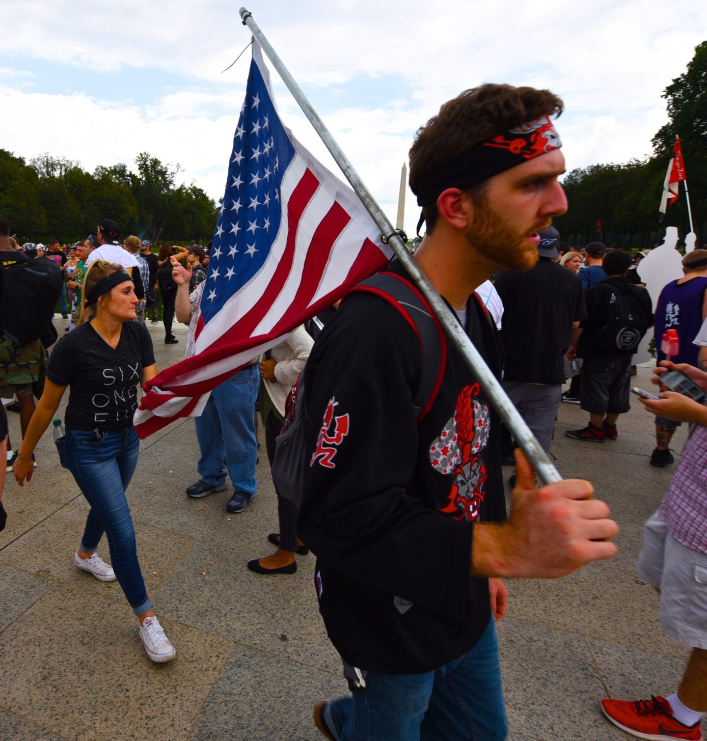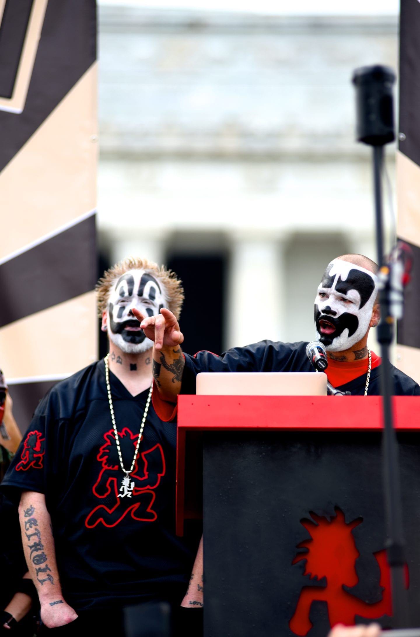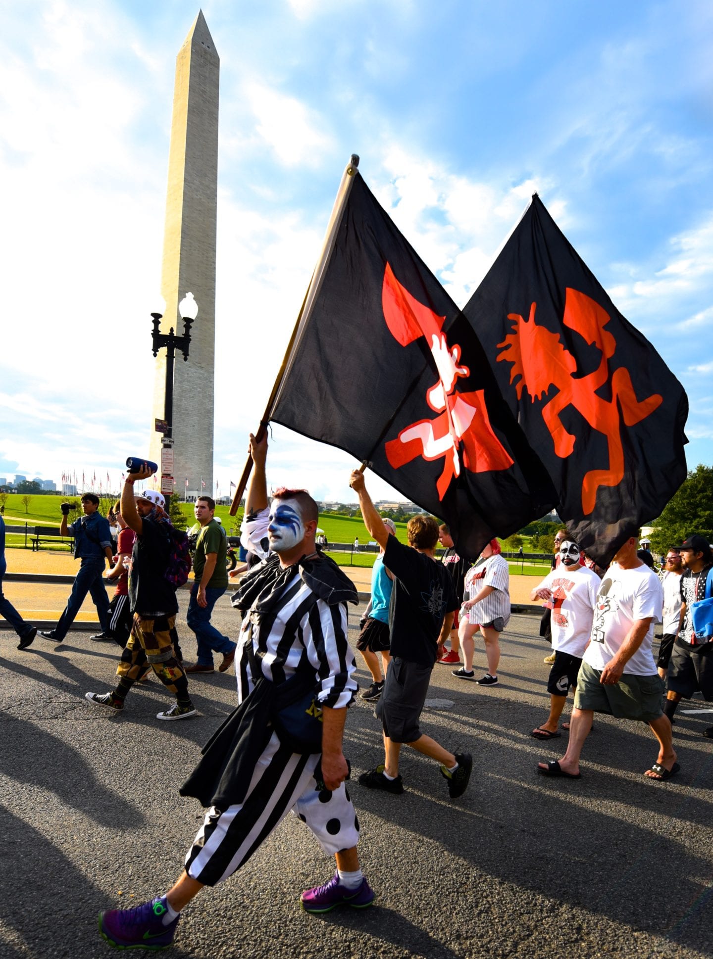 Author Steve Miller, who wrote “Juggalo” about the movement, pointed out that he has reported on the Bloods and Crips and finds that applying the same “gang” designation to the Juggalos ridiculous. The members of ICP, Joseph “Violent J” Bruce (left) and Joseph “Shaggy 2 Dope” Utsler, colorfully emphasized the nonviolent, accepting and peaceful nature of the group, before leading the Juggalos in a march from the Lincoln Memorial to the Washington Monument, passing by the World War II Memorial and the remnants of the lightly attended Trump rally.