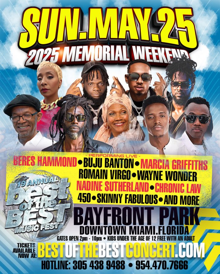 “Since the announcement of Buju Banton and Beres Hammond, we have seen an enormous increase in ticket sales as persons have decided to lock in their tickets to be a part of this historic concert and many are making this a summer trip” says Public Relations Manager Ronnie Tomlinson. “We’re also very mindful of families wanting to enjoy outdoor events together, and Best Of The Best continues to be that go-to stage show, by offering free entry for children under 12 with an adult. We make it easier for families to share in the experience. This year’s full lineup reflects the richness and diversity of Caribbean music—from legendary icons to rising stars—Best of the Best Music Fest has become the music fest that is the Heartbeat of the Caribbean, all Live on one stage and we’re proud to bring all that energy to Miami.”