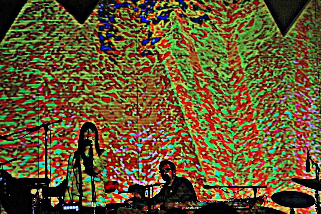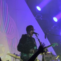 I can’t exactly come up with an exhaustive list, but there are probably few situations cooler for stage entry than approaching the eager crowd to the soul-scoping culmination of The Righteous Brothers’ “Unchained Melody.” The result was colossal, as cheers upon cheers bellowed throughout the venue while PTM let the house music submerge itself into silence before kicking the set off with “Purple Yellow Red and Blue,” a rabidly sweet tune off their latest album, Evil Friends (a Danger Mouse production). Green lasers donned a white mountainous backdrop, tossing silhouettes of instrument-masters across the outline of the stage while the music soared through the air with amplitude fit for the gods. (A note about the backdrop: this simplistic triangular cutout idea was extremely impressive in portraying a plethora of psychedelic goodies throughout the night, from Yellow Submarine-esque cartoons to various geometric visual entrapments – mucho kudos on that, ye wise band).