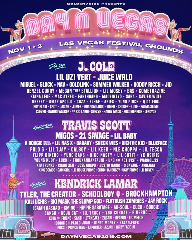 Day N Vegas will be set at the Las Vegas Festival Grounds on November 1-3, 2019 and it will be headlined by J. Cole, Travis Scott, and Kendrick Lamar. LIVE faves like Tyler the Creator, Brockhampton, Lil Uzi Vert, Migos and Schoolboy Q will all be there as well.