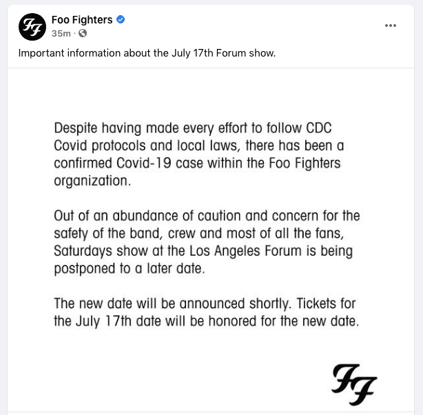 The band was set to play this weekend at The Forum in Los Angeles, but they announced today that there was a confirmed COVID-19 case within their team. So they’re going to postpone the show.
