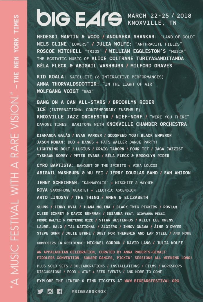 The lineup for next year’s amazing Big Ears Music Festival has been announced, and wow, this might be one of the most eclectic music festival lineups I’ve ever seen. LIVE faves like Medeski, Martin & Wood, Four Tet, Nels Cline, and Kid Koala will all be there, but get a look at this full lineup below.