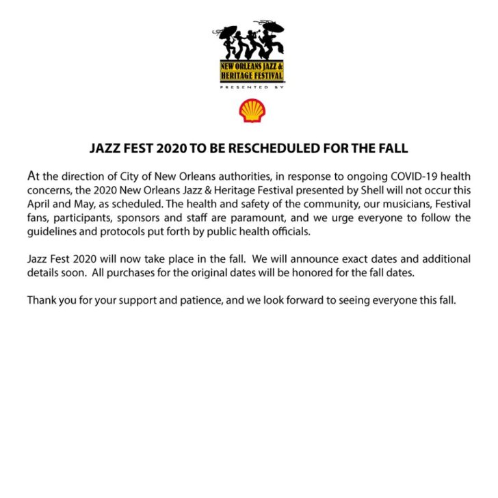 New Orleans Jazz Fest Postponed to Fall Due to Coronavirus COVID-19 Outbreak
