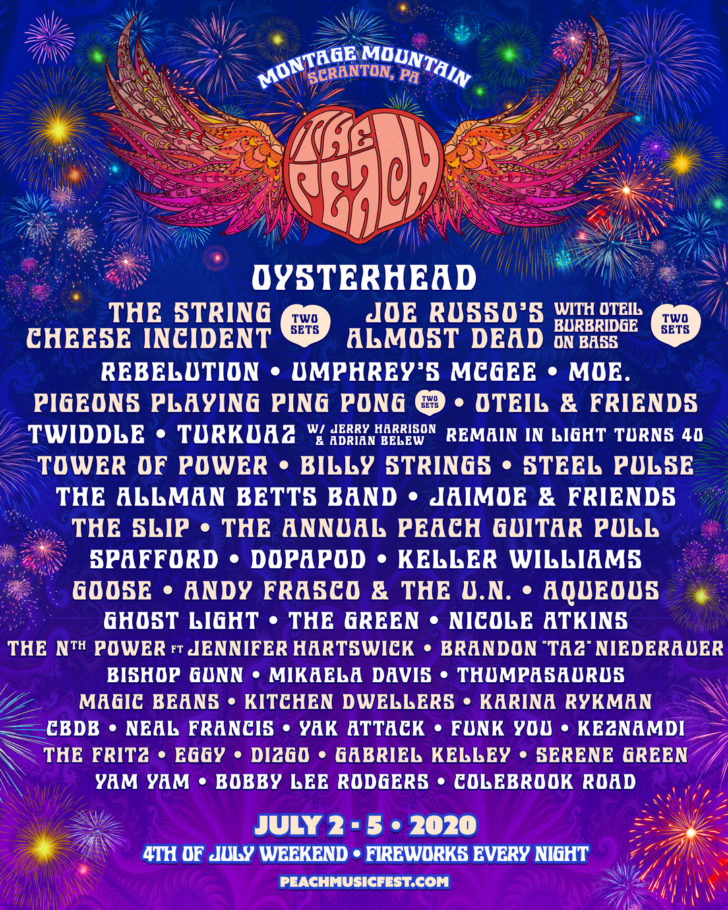 Just announced! The Peach 2020 returns to Montage Mountain in Scranton, PA over the weekend of July 2-5, 2020 and will be headlined by Oysterhead, String Cheese Incident, and Joe Russo’s Almost Dead (featuring Oteil Burbridge). They’ll be joined by Umphrey’s McGee, moe., Oteil & Friends, Twiddle, and Turkuaz will be joined by Jerry Harrison & Adrian Belew doing the 40th Anniversary of Remain In Light.