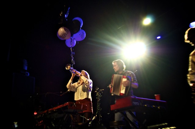 Of Monsters and Men just had to celebrate when I saw them last month (back on Tuesday April 3rd), as it was their first album release show, their first show in here in and it was the first of two sellout shows at the TLA. None of which are small feats for this six piece Icelandic band. The band came out, lead by co-singers Nanna Bryndís Hilmarsdóttir and Ragnar “Raggi” Þórhallsson, and they seemed nervous, not knowing how to deal with the packed theatre. But quickly myself and the other attendees were reassured as to why this band won the Músíktilraunir (Icelandic Battle of the Bands) held every year in Reykjavík. More than half of the set was completely filled with new songs, from an album that happened to have been released that day. But thanks to NPR’s First Listen series and the internets, nearly every song they played was melodically chanted along with by the crowd, some with more tonal delight than others.
