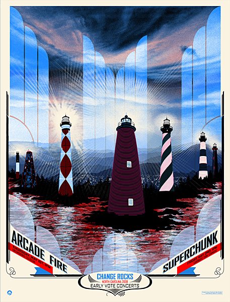 Last year Wes Winship took over the primary design duties for the Arcade Fire posters, and he put out some beautiful pieces. This poster for last weekend’s Obama benefit with Superchunk picks up where the others left off. Visually Wes has tied back to the most recent posters for Arcade Fire’s European tour, which all feature a blue and red motif with towers. The red and blue fit seamlessly into a patriotic color scheme, but he has tailored the European imagery with something more befitting a concert in support of Senator Barack Obama.