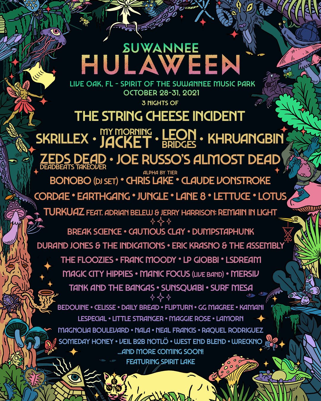 Suwannee Hulaween has announced its 2021 lineup! String Cheese Incident will anchor the event and will welcome dubstep maestro Skrillex, My Morning Jacket (who just announced a full set of tour dates), Leon Bridges and Khruangbin as top billing.
