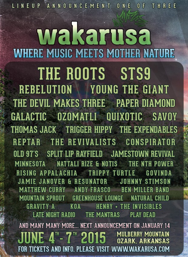 The first set of artists on the lineup for Wakarusa 2015 have been announced! Headlining this year will be The Roots and STS9, with LIVE faves like Paper Diamond, Galactic, and Conspirator all joining them towards the top of the lineup. Many more amazing artists are on the bill already with tons more to be announced.