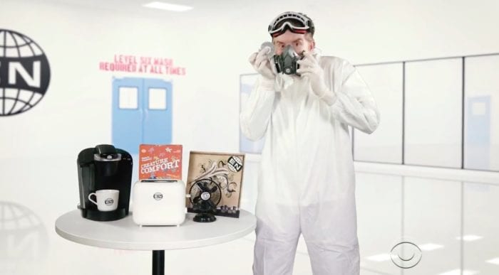 Arcade Fire is back in full swing and stopped by The Late Show with Stephen Colbert to play some tracks off their new LP, Everything Now. And they even got some marketing help to kick the segments off…